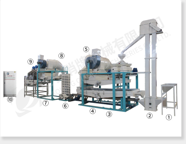 ① 上料斗② 斗式提升機 ③ 脫殼、風(fēng)選、分選主機 ④ 板簧輸送機 ⑤ 立式風(fēng)選系統(tǒng) ⑥ 螺旋提升機 ⑦ 振動輸送風(fēng)選機 ⑧ 立式風(fēng)選系統(tǒng) ⑨ 靜電風(fēng)選機 ⑩ 電氣控制柜