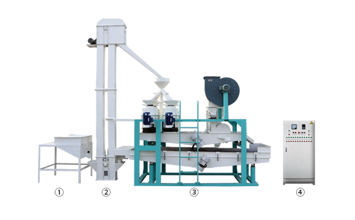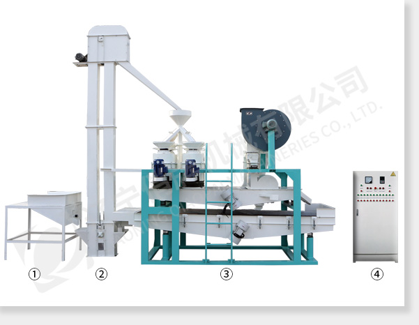 ① 上料斗② 斗式提升機 ③ 脫殼、風選、分選主機 ④ 電氣控制柜