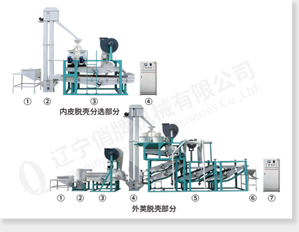外莢脫殼部分:① 螺旋上料斗 ② 原料提升機 ③ 多功能除雜機 ④ 斗式提升機 ⑤ 脫莢、風選、分選設備 ⑥ 接料斗 ⑦ 電氣控制柜