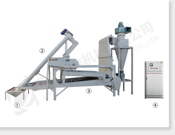 ① 上料斗 ② 絞龍螺旋輸送機 ③ 脫殼、風(fēng)選、分選主機 ④ 電氣控制柜
