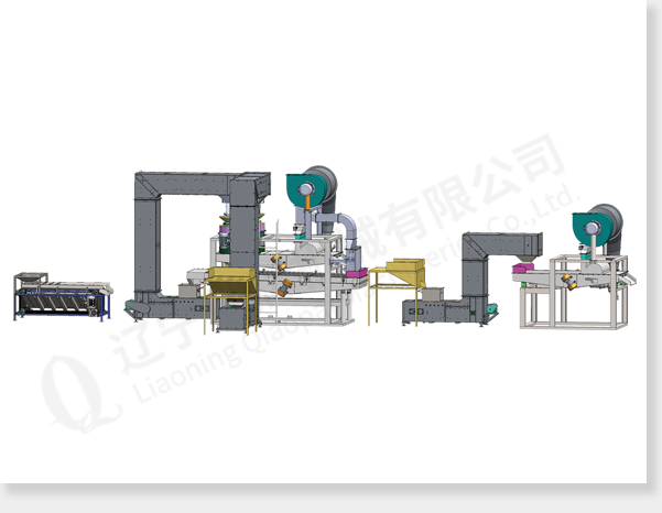Первая секция-калибровка: приёмный бункер, Z-образный ковшовый элеватор, калибровочное сито (количество зависит от сырья).